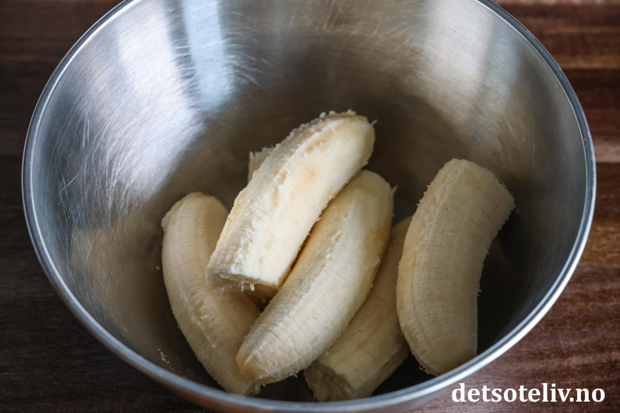 ♥ Jeg bruker stavmikser til å mose bananene, men det går også fint å mose bananene enkelt med en gaffel.
