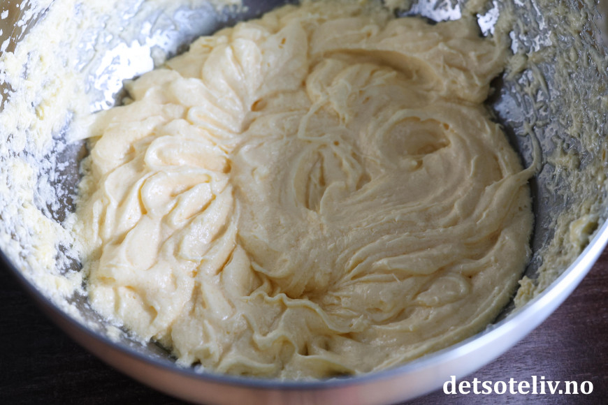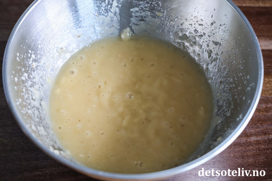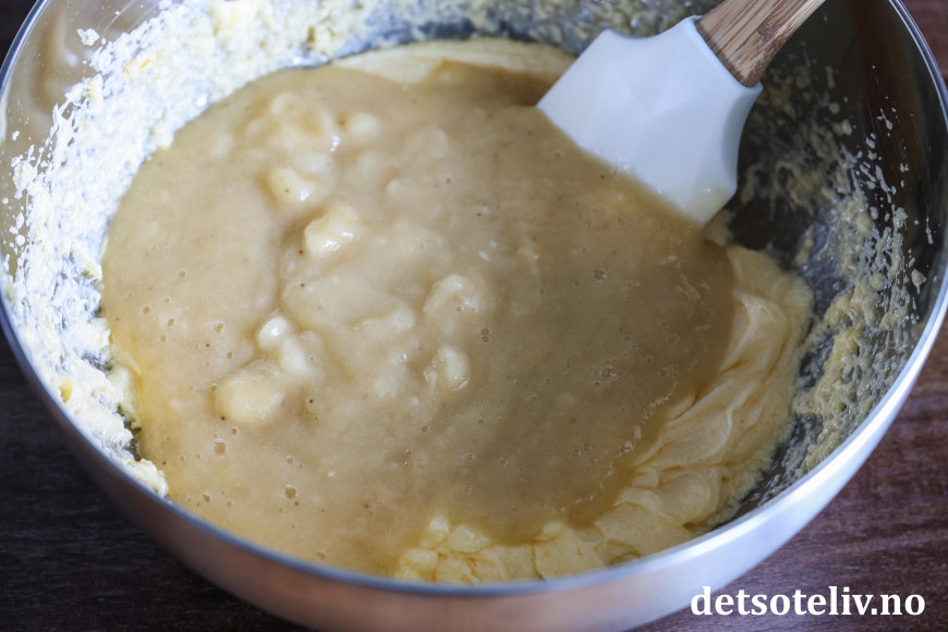 Pisk mykt smør og sukker godt sammen. Tilsett eggene, ett om gangen, og pisk videre til en luftig smørkrem. Mos bananene (se tips) og vend bananmosen inn i deigen.