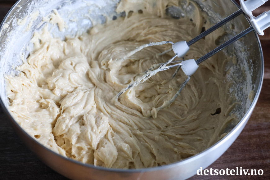 Sikt hvetemelet sammen med vaniljesukker og bakepulver og bland dette raskt inn i deigen (se tips).