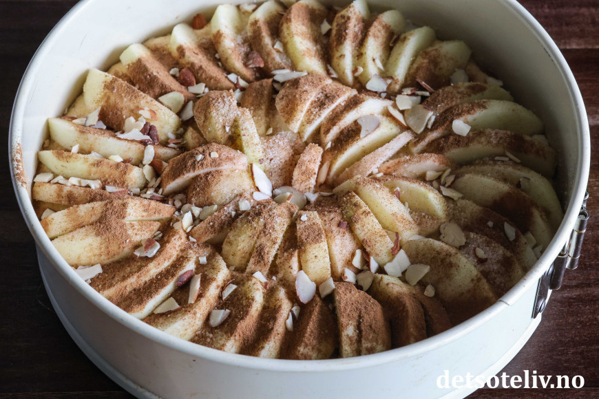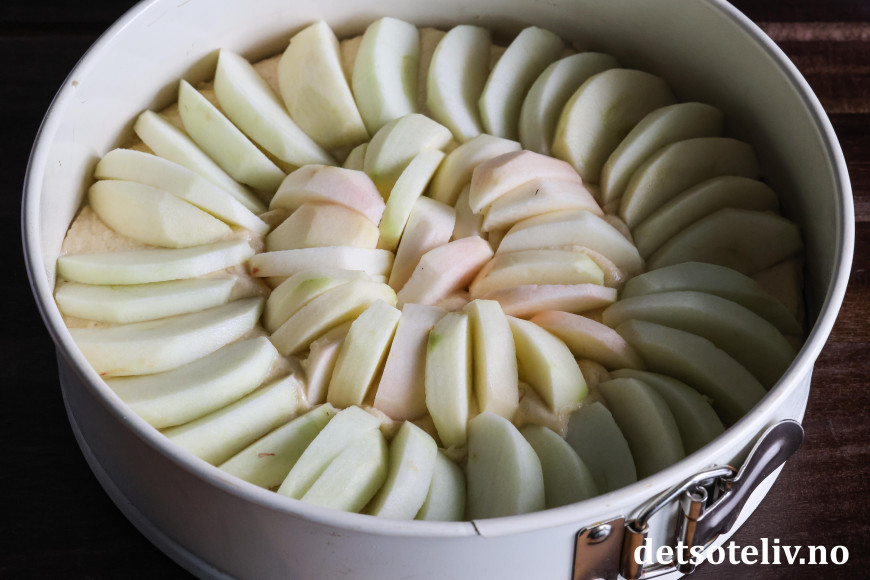 Rens eplene og skjær dem i skiver. Legg skivene på toppen av kaken.