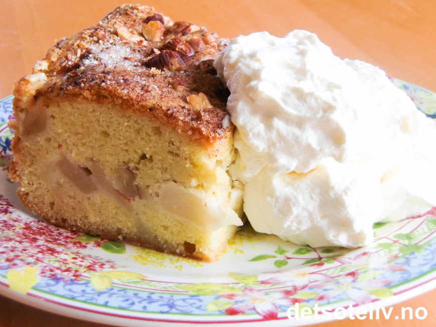 Kaken har et deilig lag med epleskiver inni kaken og drysses med sukker, kanel og mandler på toppen.