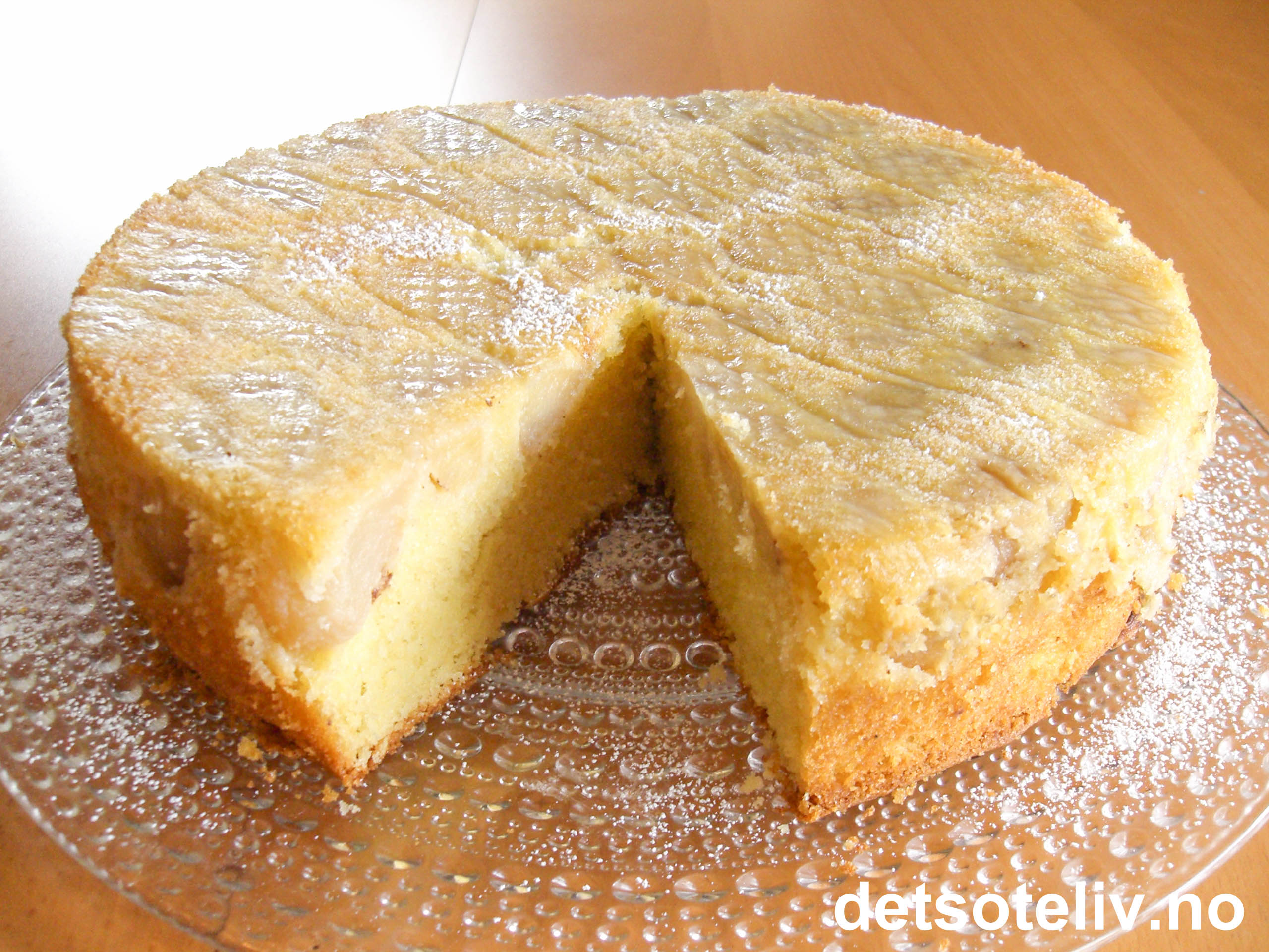 Eplebitene vil antakeligvis synke til bunns i kaken under stekingen (det gjorde de i alle fall hos meg). Et tips er da å servere kaken opp-ned, slik at eplene kommer øverst (se kakebildet).