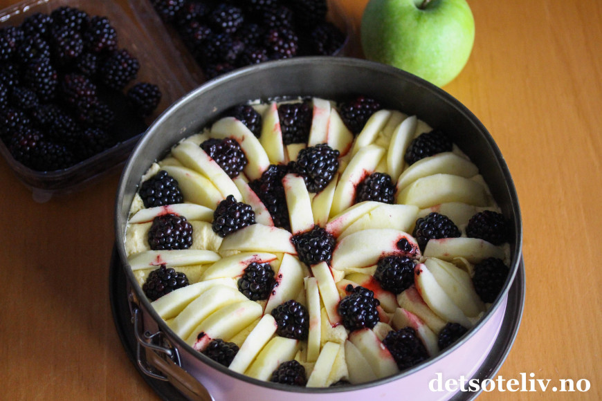 Bjørnebærene gir bare god smak, men også spennende farge på eplekaken!
