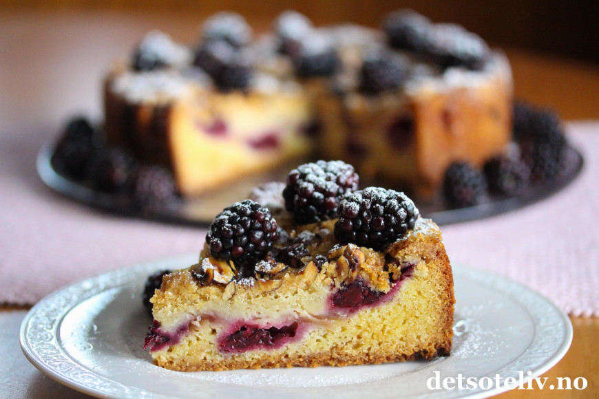 Pynt kaken med friske bjørnebær og et melisdryss rett før servering.