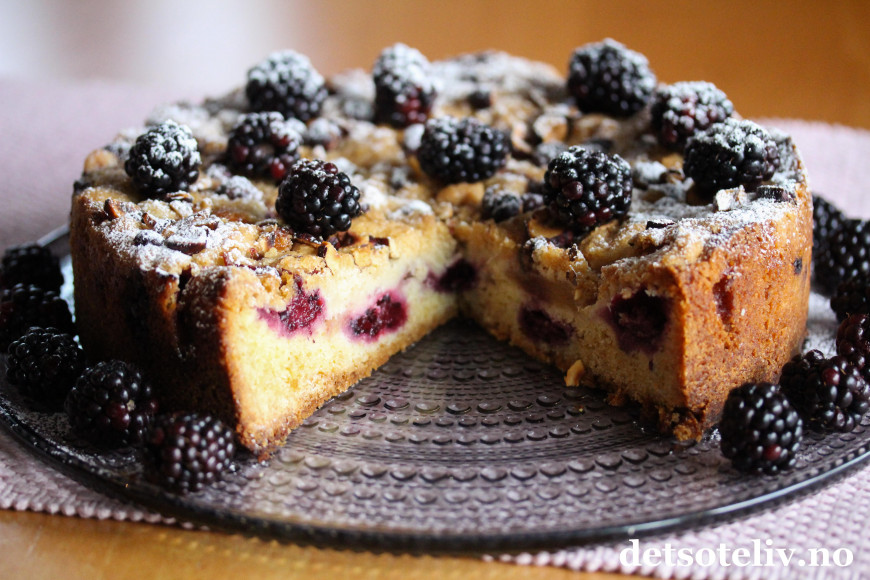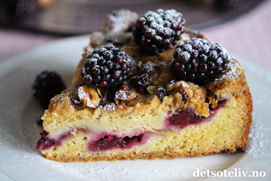 Denne kaken er basert på samme oppskrift som Eplekake med bringebær som jeg tidligere har publisert her på Det søte liv, bare at jeg her altså bruker bjørnebær i stedet for bringebær. Jeg har også byttet mandelflak med hasselnøtter, men det gjør du som du vil med - begge deler blir digg!