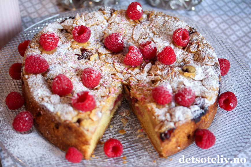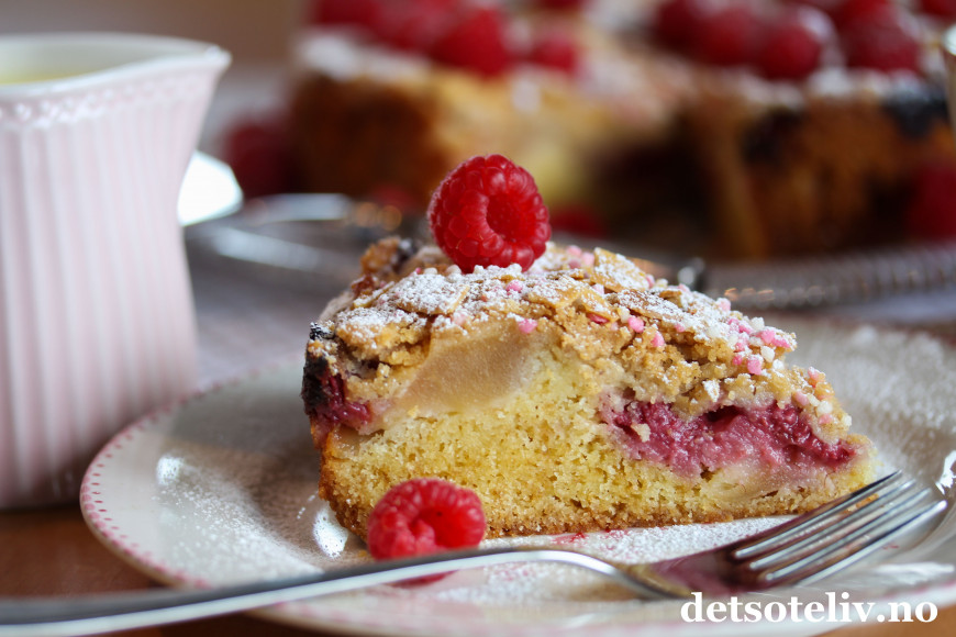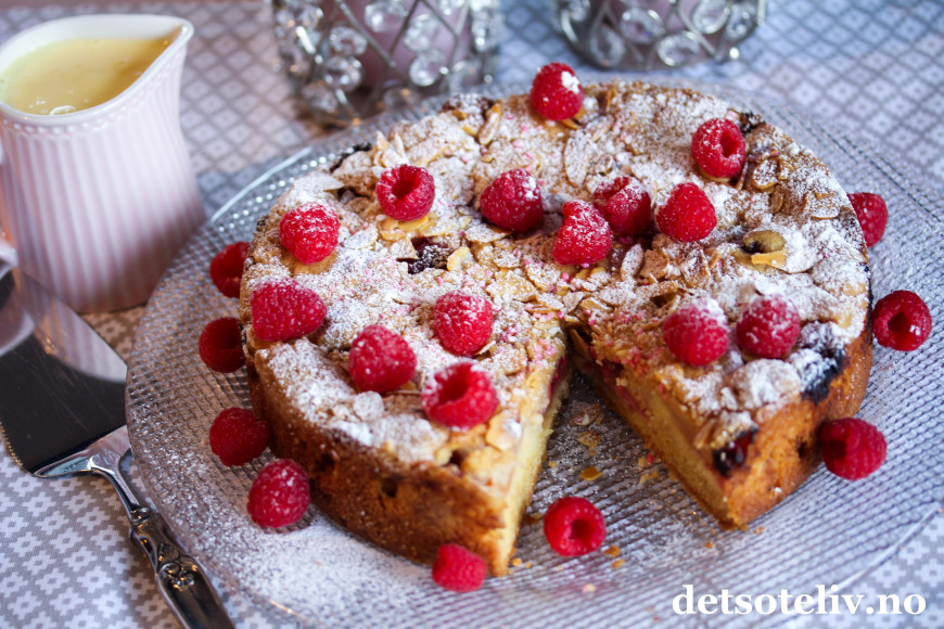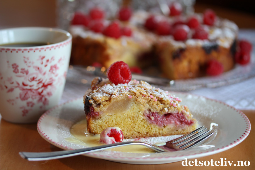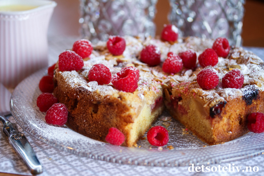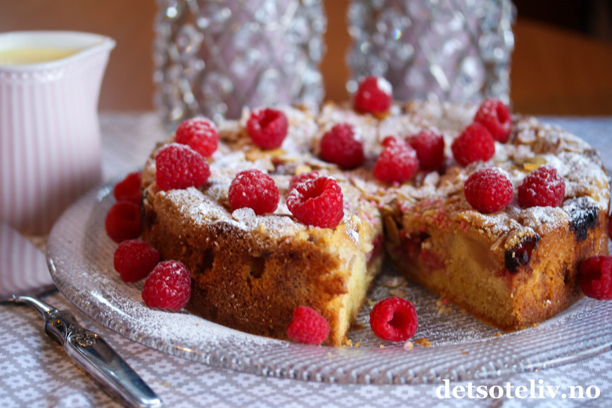 ♥ Du kan bytte ut bringebærene med andre type bær. Se f eks Eplekake med bjørnebær, som er basert på samme oppskrift.
