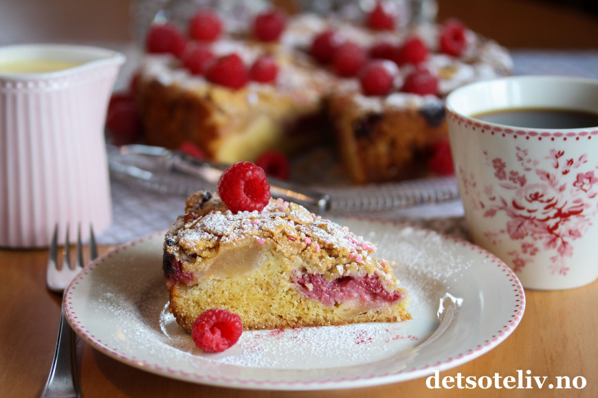 Nyt denne deilige søndagen med en nystekt, sommerlig Eplekake med bringebær!