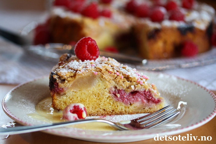 Jeg har tatt utgangspunkt i min favorittoppskrift på Eplekake, og lagt bringebær på kaken i tillegg til eplene. Toppen av kaken er dekket med et lite lag smuldredeig og mandelflak, som gjør kaken ekstra god.