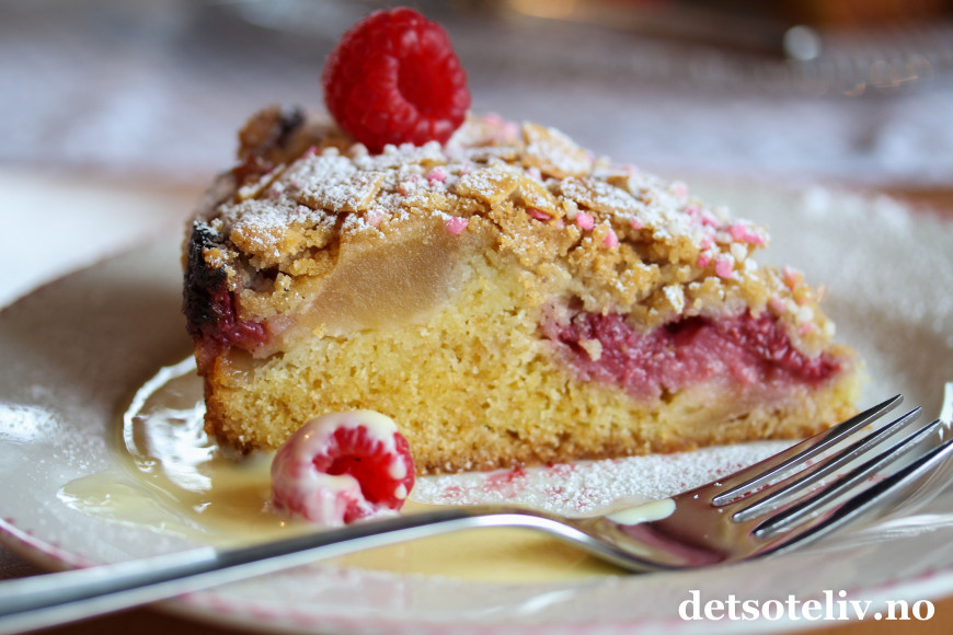 ♥ Det er viktig at kaken blir helt gjennomstekt i midten. Bringebærene gir fuktighet, så kaken må stekes noe lenger enn en vanlig eplekake. Jeg stekte kaken min i 1 time og lot kaken deretter bli stående en god stund i ovnen på ettervarmen. Kjenn etter med kakenål og tilpass steketiden etter din ovn. Hvis du synes kaken blir for mørk på toppen selv om den ikke er gjennomstekt, kan du dekke over kaken med et stykke bakepapir eller aluminiumsfolie den siste delen av steketiden.