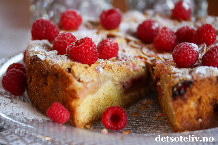 Server kaken med friske bringebær og et melisdryss, og gjerne hjemmelaget vaniljesaus ved siden av.