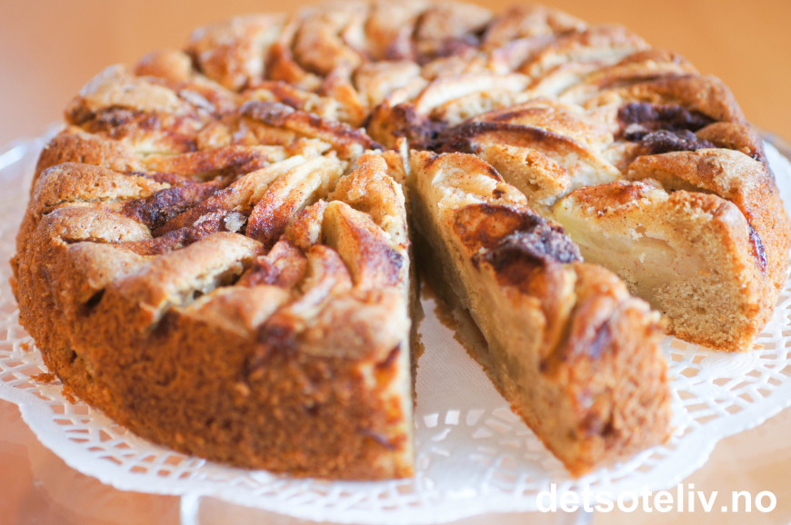 Server eplekaken lunken med vaniljesaus, pisket krem og/eller vaniljeis. Råkrem, som er en blanding av krem og eggedosis, er også godt til! Du finner oppskrift på råkrem på Det søte liv.