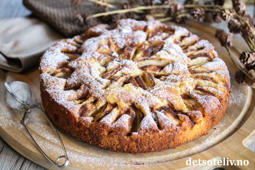 Her har du en gammeldags og enkel, men veldig god og saftig eplekake som inneholder fløte i deigen. Kaken smaker spesielt nydelig dersom den serveres lunken sammen med vaniljesaus.