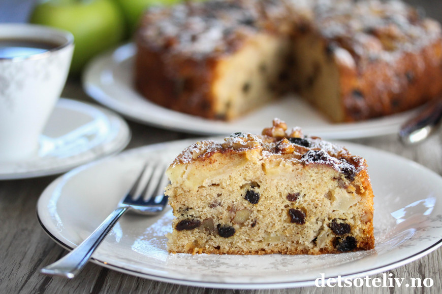 Denne eplekaken er både saftig og veldig smakfull og lages med kanel, rosiner og valnøtter.
