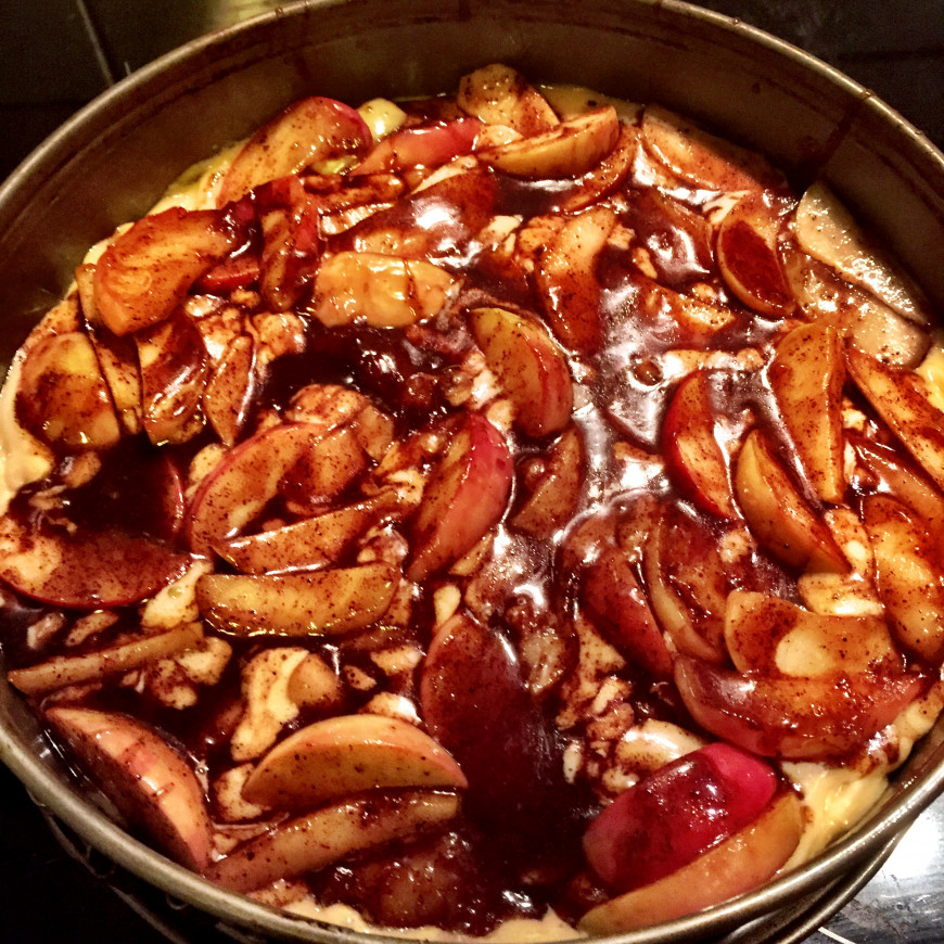 Legg eplebitene jevnt utover kaken. Fordel det som måtte være igjen av sukker-/smør-/kanelsausen i stekepannen over eplene.