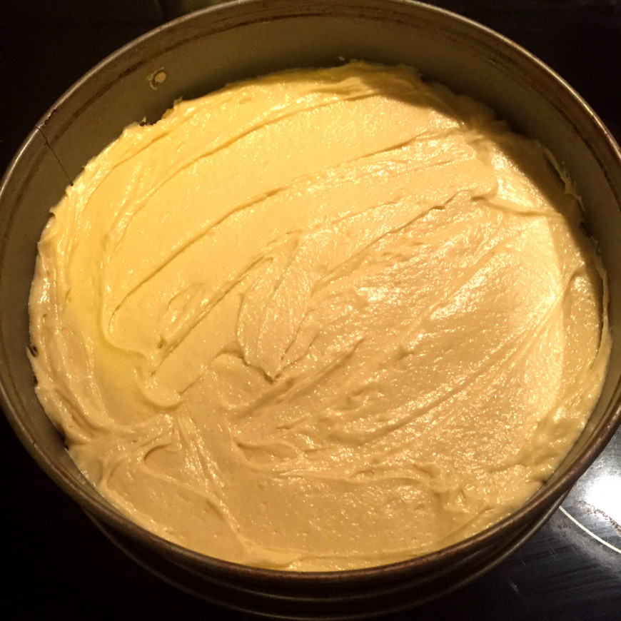 Ha deigen i en rund kakeform (26 cm i diameter) med bakepapir i bunnen og glatt til overflaten.