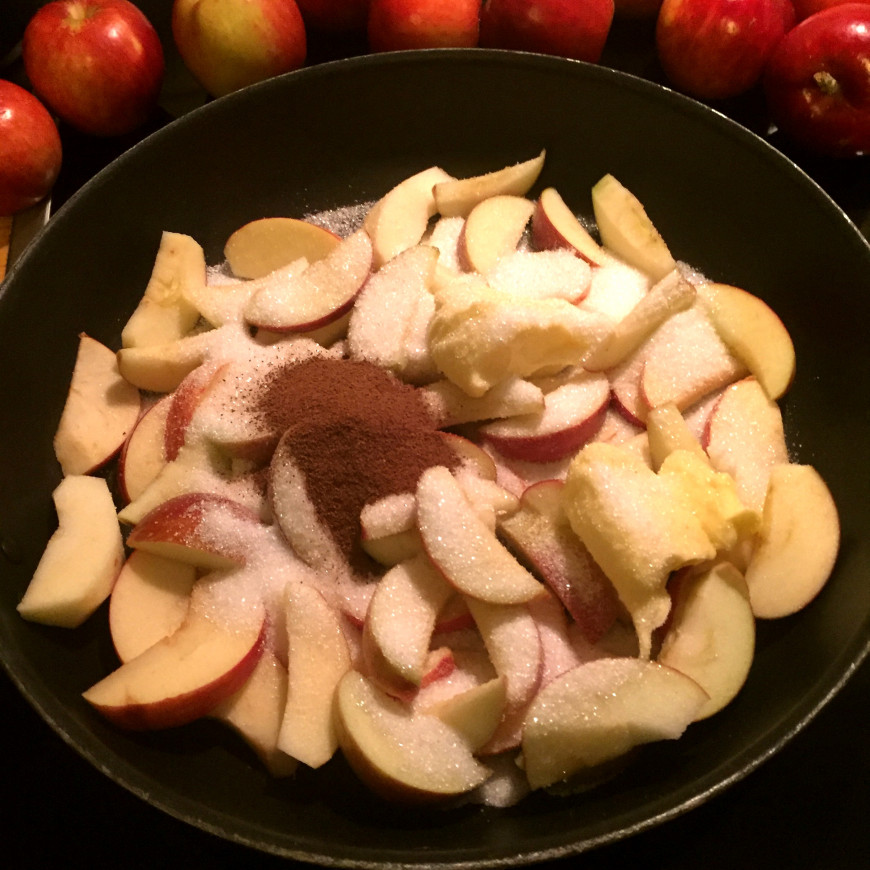 Ha eplebitene i en stekepanne sammen med sukker, smør og kanel.