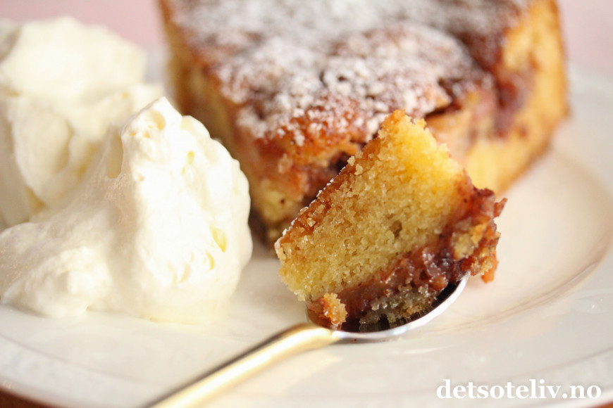 Dette er en kjempegod og saftig eplekake der eplebitene karamelliseres med sukker, smør og kanel før de legges på kaken.