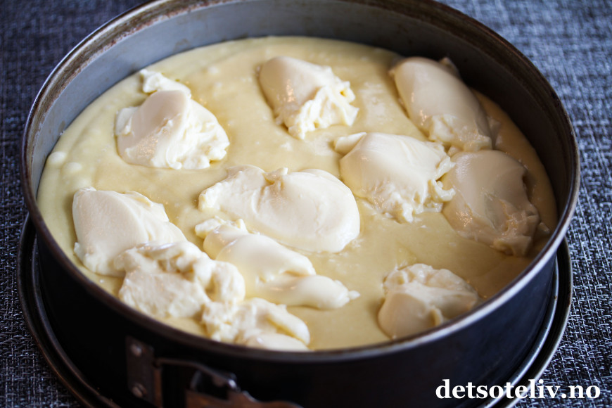 Ha deigen i en rund form (26 cm i diameter) med bakepapir i bunnen.