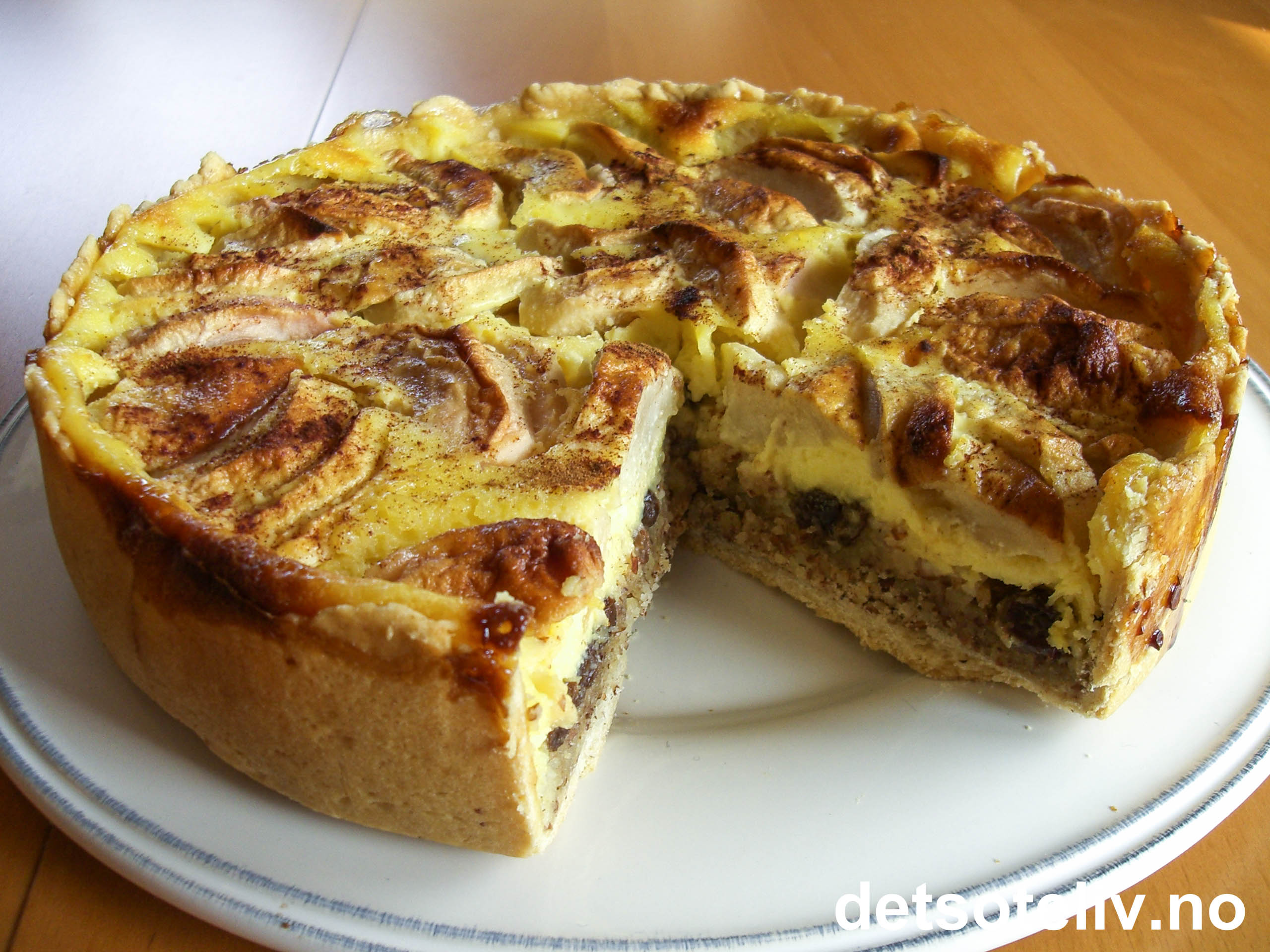 Strø på malte mandler og fordel rosinene over. Legg så på eplene i takstenmønster. Hell over rømmefyllet. Dryss på litt kanel til slutt.
