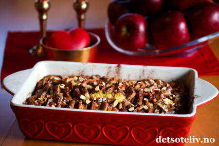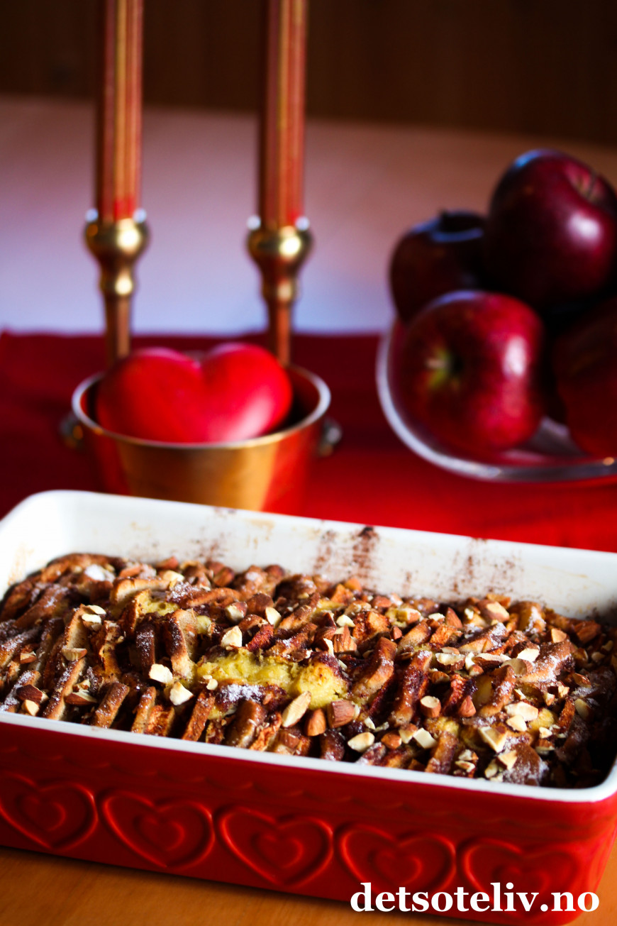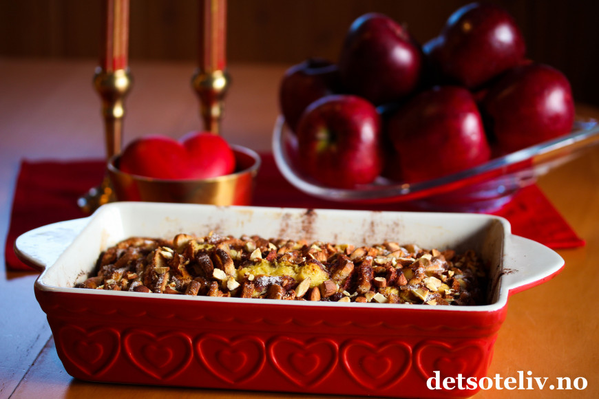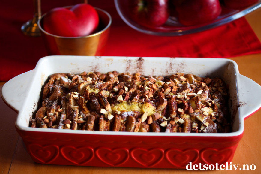 Du finner såklart massevis av kakeforslag til alle nevnte anledninger her på Det søte liv (se link til sesongkategoriene ovenfor), og nye tips vil komme til også i år. Først ut er en deilig eplekake med marsipan, mandler, sukker og kanel. Jeg lager denne kaken ofte til jul, men synes den passer like utmerket både til morsdagen og valentinesdagen (og alle andre dager i året også... ). Raspet eple i deigen i tillegg til epleskivene oppå kaken gir ekstra god eplesmak og gjør kaken saftig. Jeg bruker råmarsipan av beste kvalitet og da blir eplekaken fantastisk god!