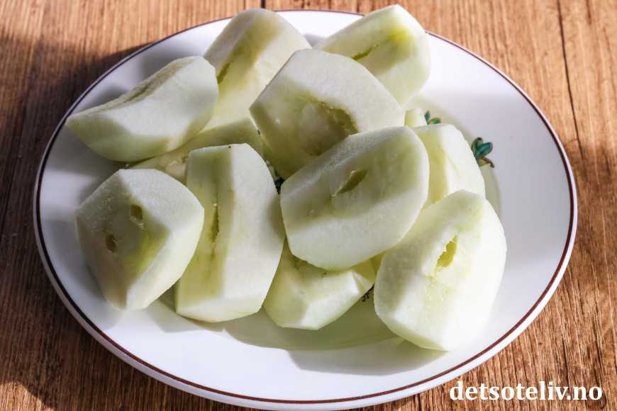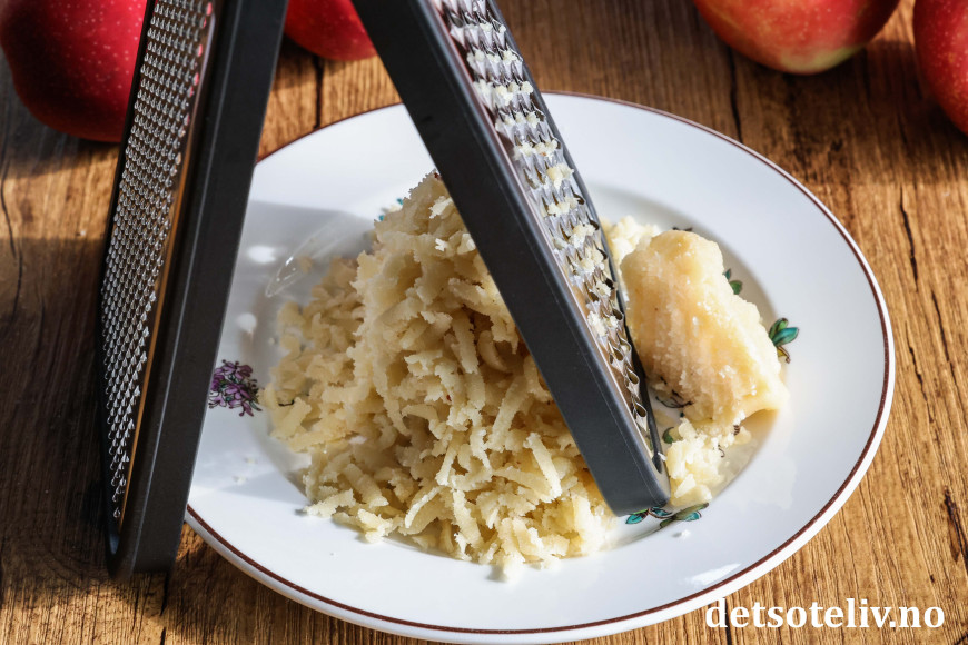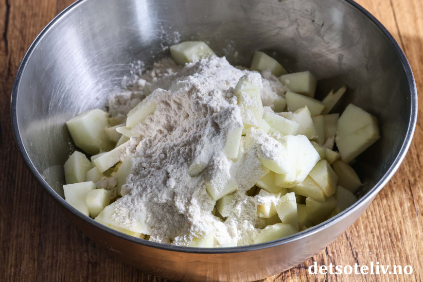 Bland eplebitene sammen med hvetemelet som du har satt til side.
