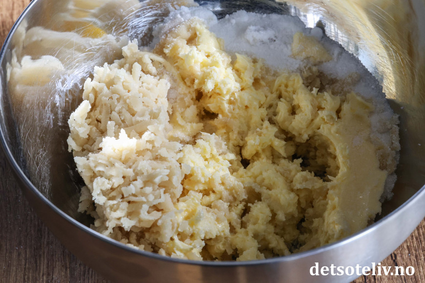 Sett til side 50 gram av hvetemelet. Bland resterende 200 gram hvetemel med bakepulver og vend dette inn i smørkremen.