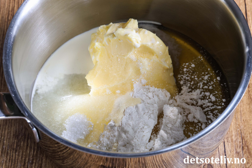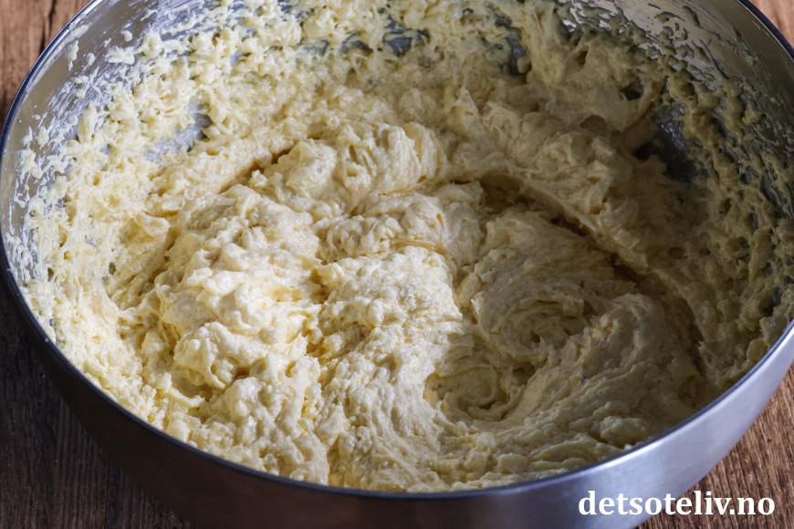 Pisk mykt, romtemperert smør sammen med sukker og vaniljesukker.