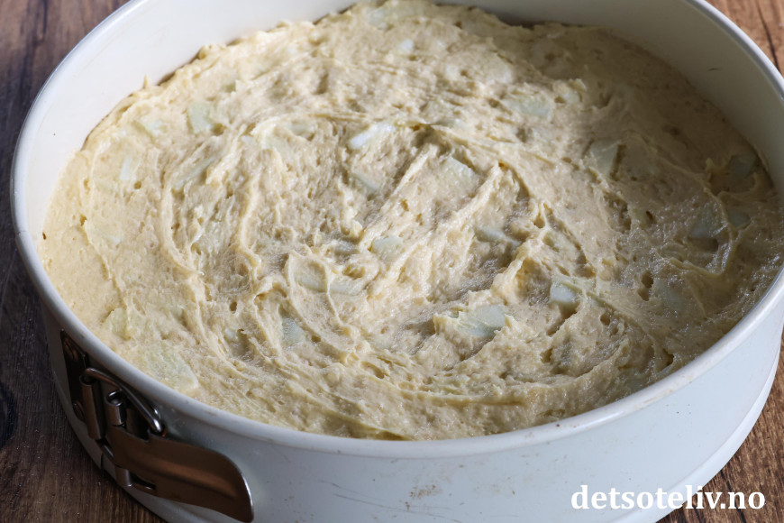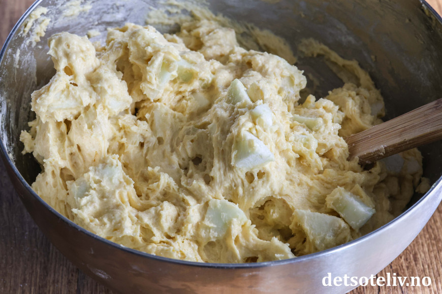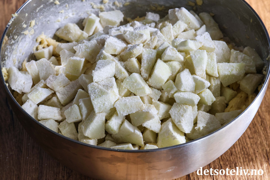 Skrell og rens eplene og skjær dem i små biter. Bland eplebitene sammen med hvetemelet som du har satt til side. Vend dette deretter inn i deigen.