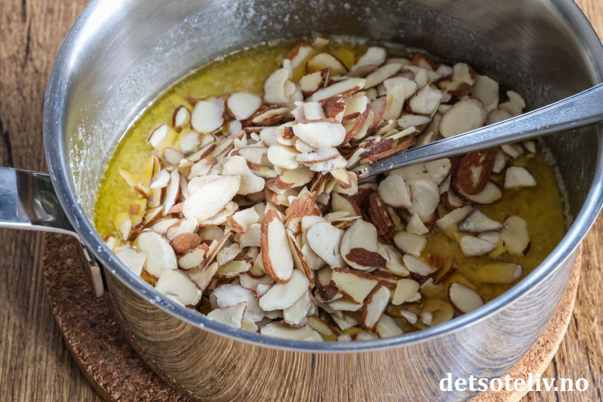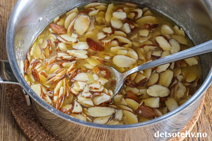 Ha alle ingrediensene unntatt mandelflak i en liten kjele. Varm opp til smøret smelter mens du rører glasuren jevn. Bland inn mandelflak.