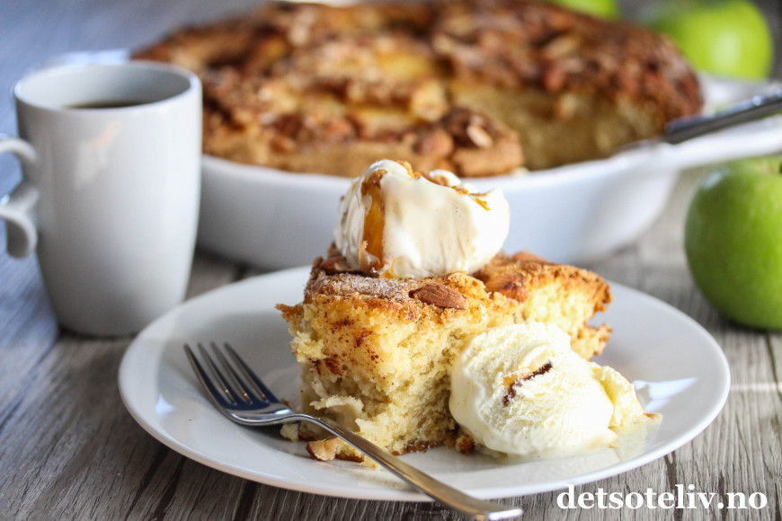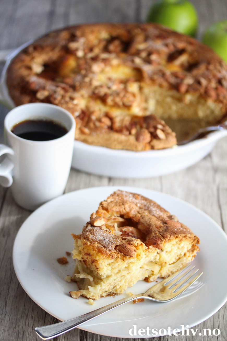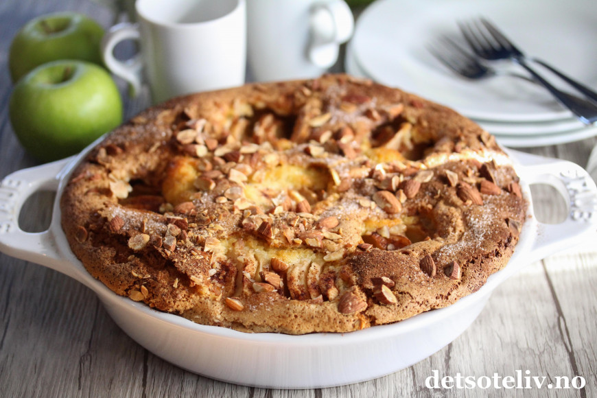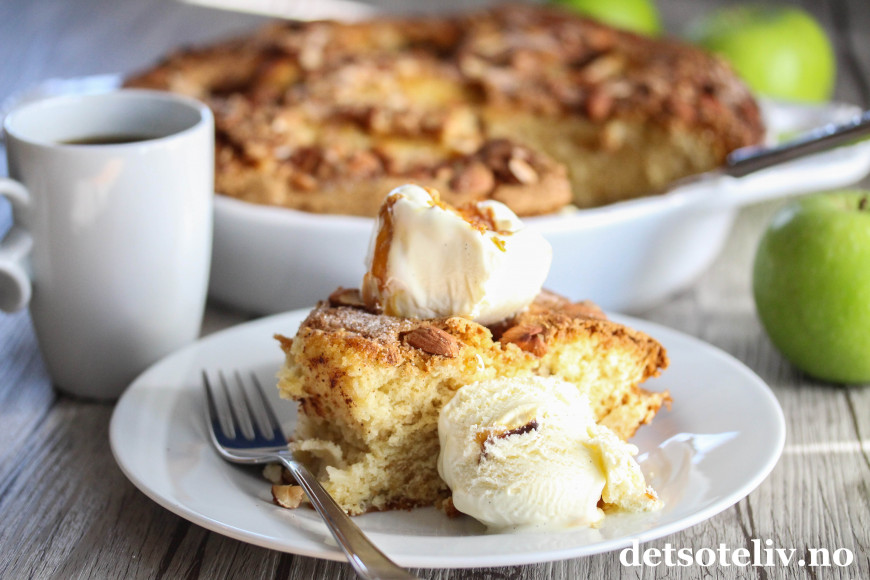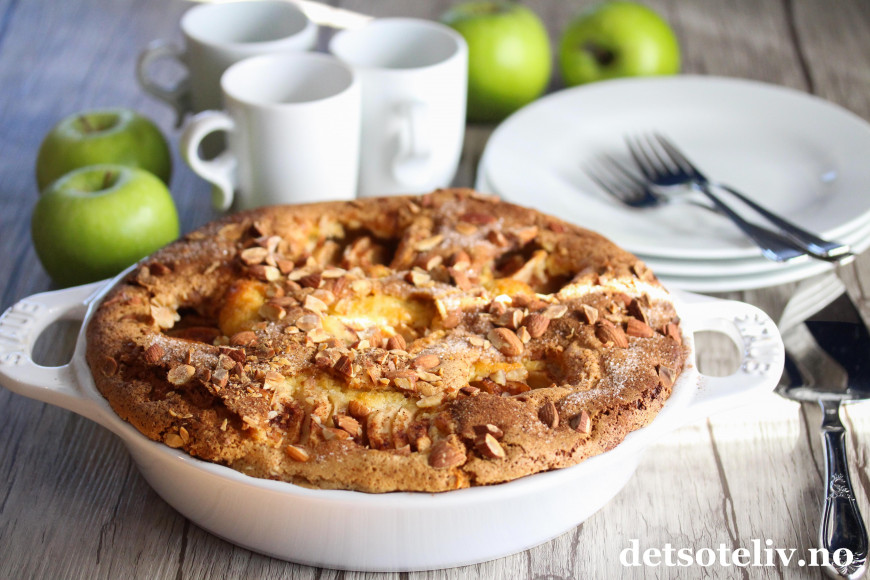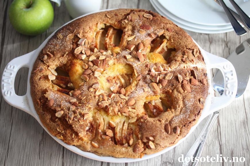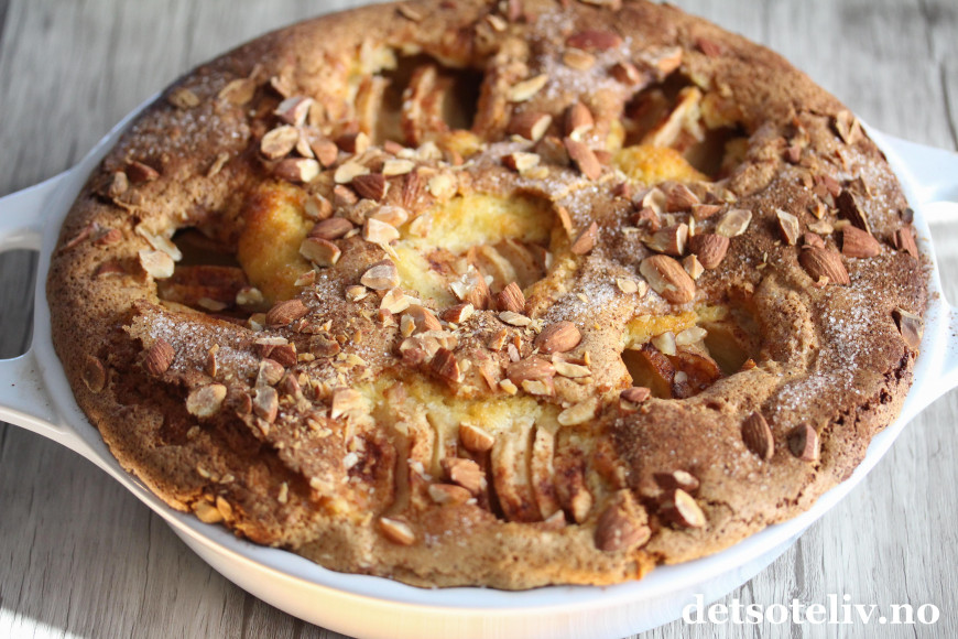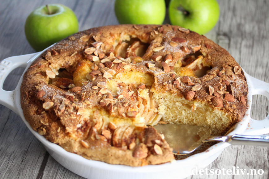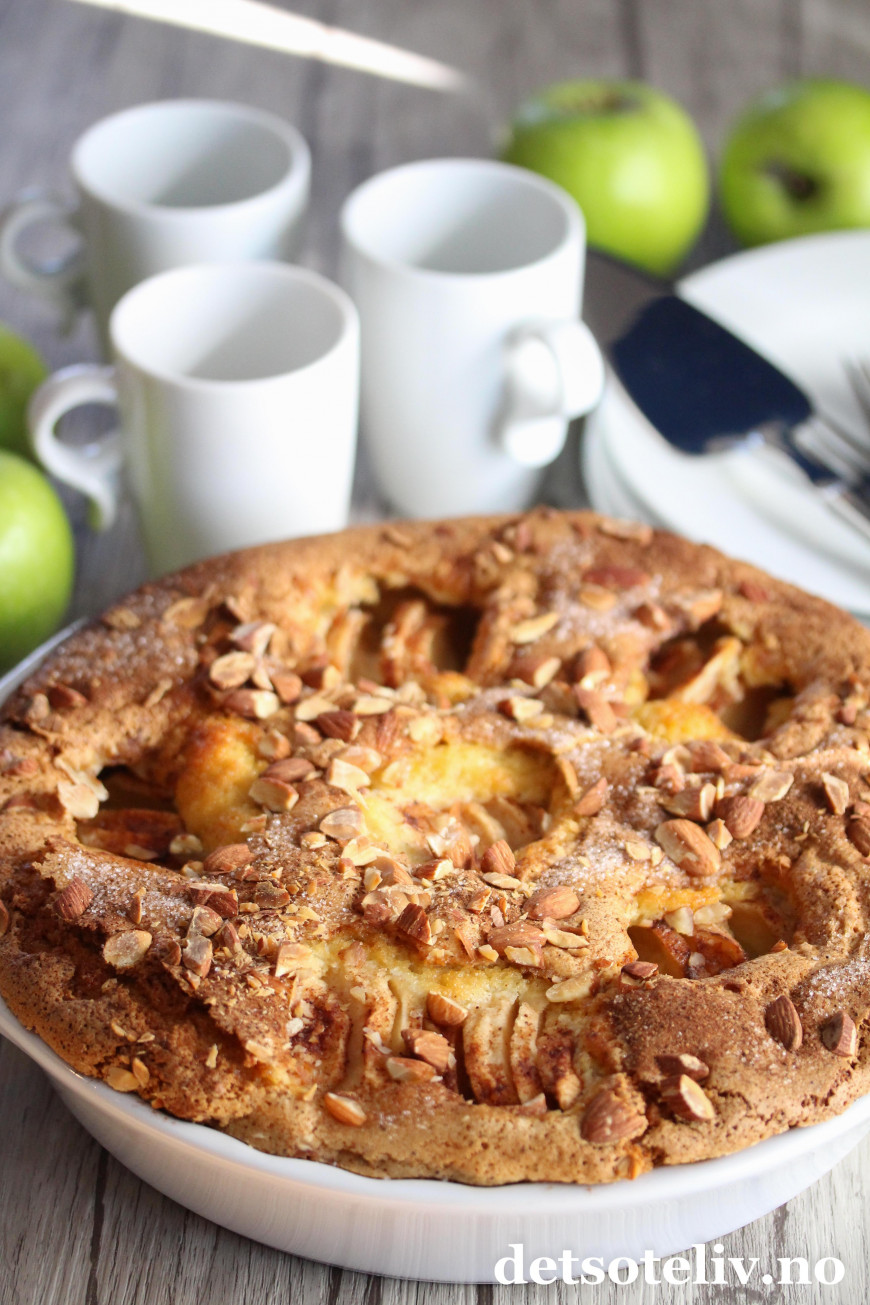 Den beste eplekake familien har spist. Vi droppet mandler (pga allergi) og byttet ut sukkerpiller toppen med brunt sukker :)