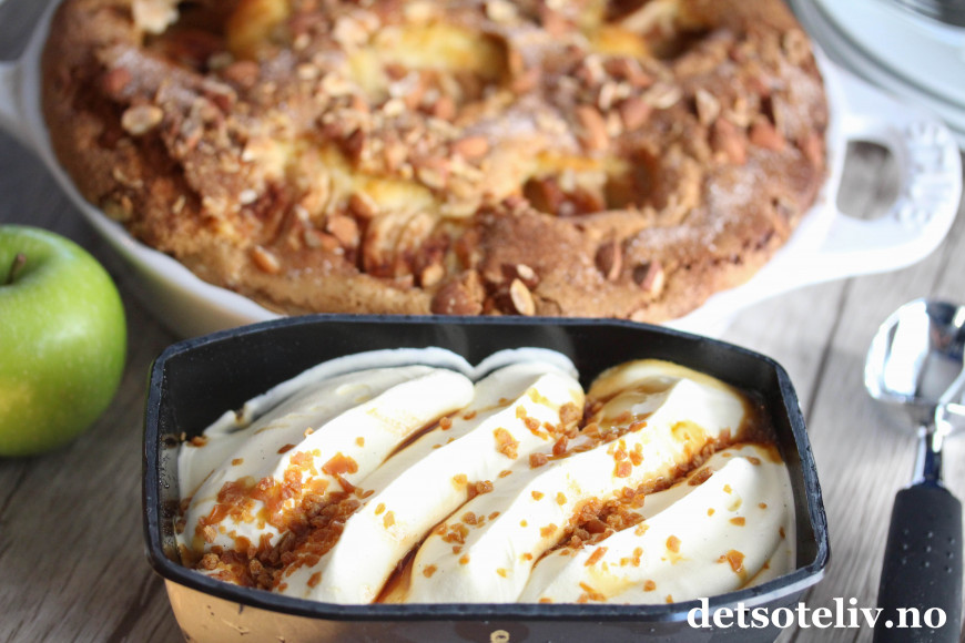 Serveres varm og nystekt med en god iskrem ved siden av.