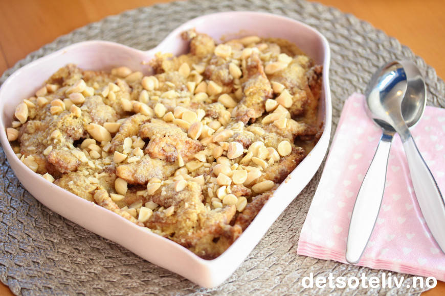 Stekes midt i ovnen ved 150°C i 45 min. Serveres varm og nystekt, gjerne med vaniljeis.