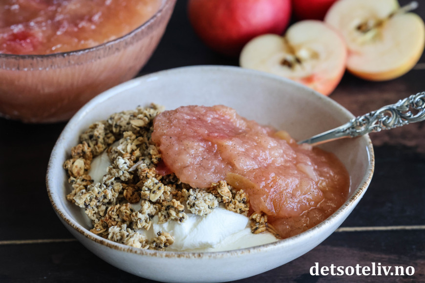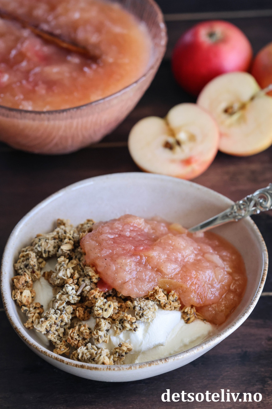 Her har jeg hatt nykokt eplegrøt på gresk yoghurt og granola. 😋