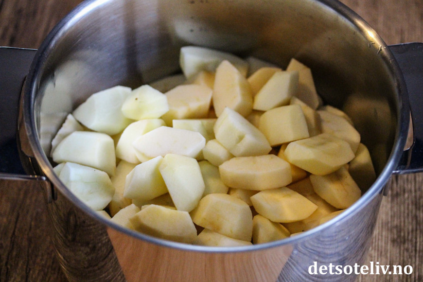 Skrell og rens dem (skjær bort det som eventuelt er brunt og dårlig på eplene), og ha båtene i en stor kjele.