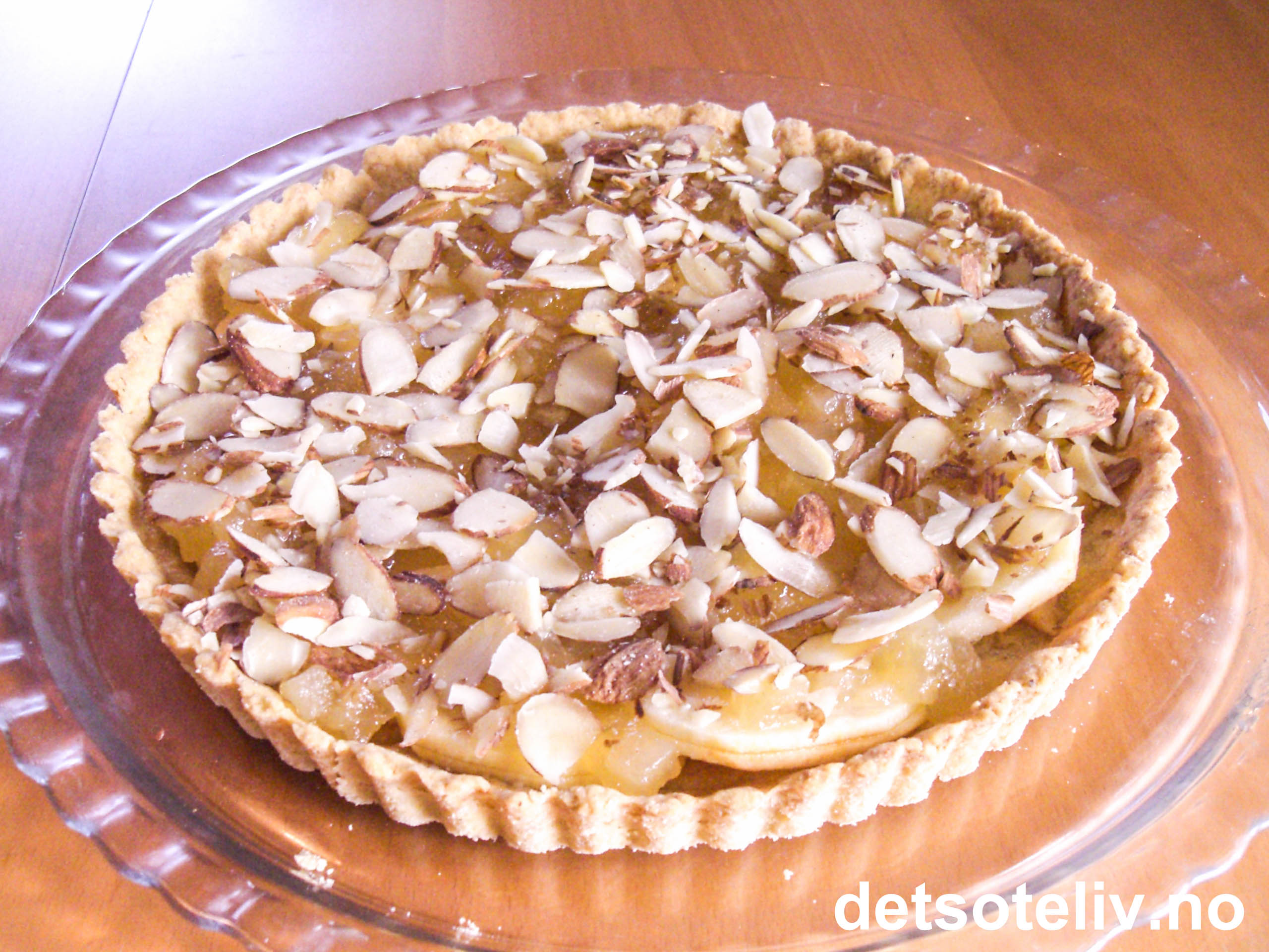 Ta paibunnen ut av formen og sett den på et passende fat. (Behandle kaken forsiktig, for den er skjør og kan lett gå i stykker.) Dekk bunnen med tynne epleskiver. Legg over eplesyltetøy og dryss over mandelspon.