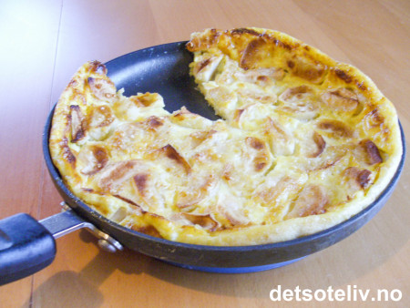 Pannekaken kan blåse seg litt opp under stekingen, men plaffer sammen og blir flat igjen når du tar den ut av ovnen.