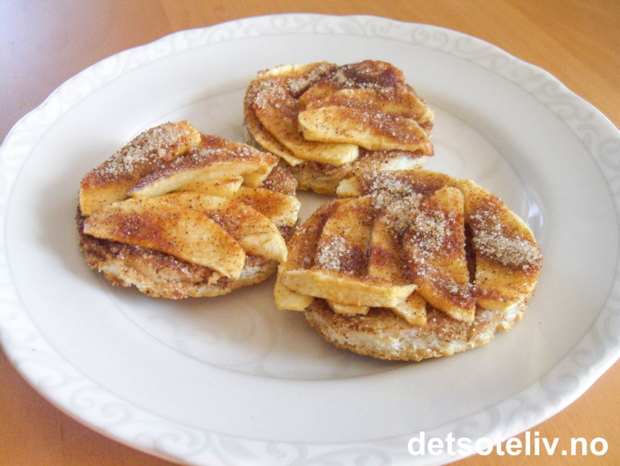 Bland sammen sukker og kanel og strø halvparten over skivene. Skjær eplene i tynne båter og legg på skivene. Strø over resten av sukker- og kanelblandingen.