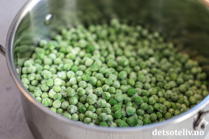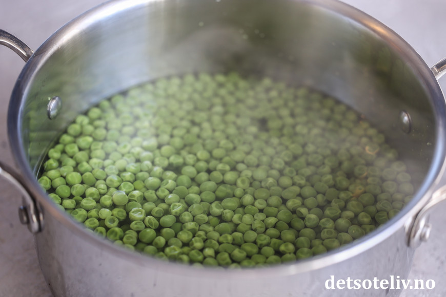 Ha ertene i en kjele. Tilsett kokende vann og la ertene småkoke i ca. 5 minutter.