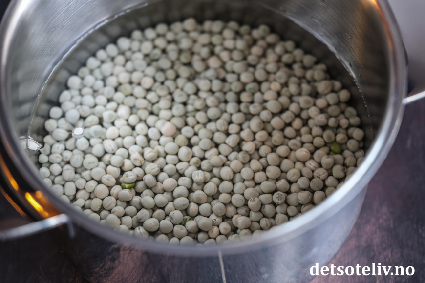 Start dagen i forveien med å legge tørkede, grønne erter i bløt i rikelig med kaldt vann (beregn ca. 2 liter).