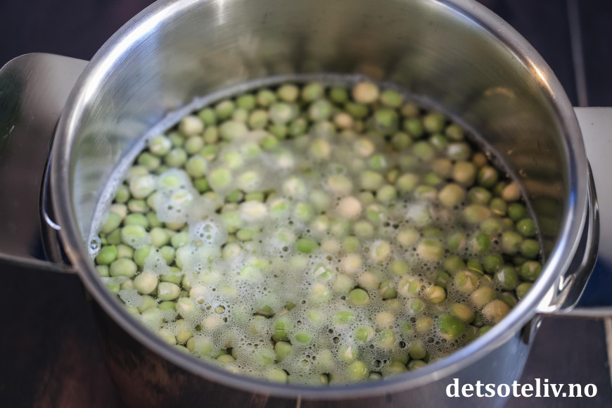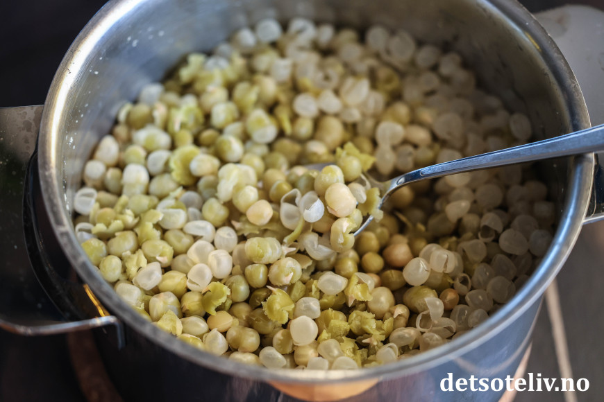 Fyll opp med nytt, kaldt vann slik at vannet legger seg et par cm over ertene. La ertene småkoke under lokk i ca. 1,5 time, til ertene er blitt helt møre.