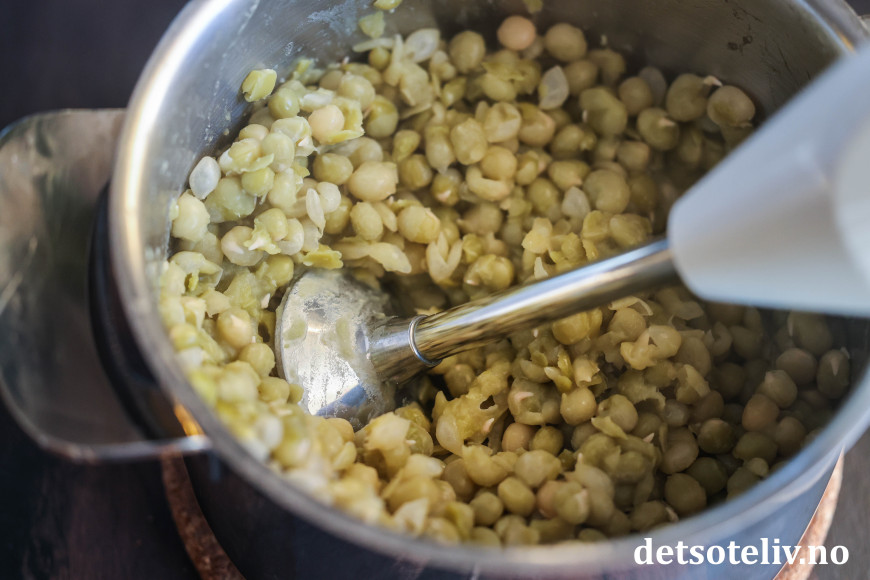 Bruk en stavmikser til å kjøre ertene så vidt sammen slik at du får en grov ertestuing. Det er ikke meningen at ertestuingen skal bli glatt, så bruk stavmikseren bare noen få sekunder. Det kan gjerne være noen hele erter igjen i ertestuingen.