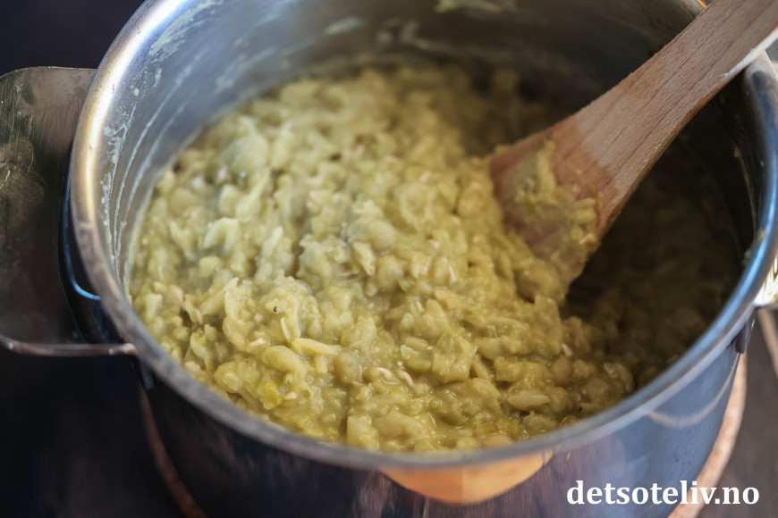 ♥ Du kan gjerne lage dobbel porsjon og bruke hele pakken når du først er i gang. Ferdiglaget ertestuing kan fint fryses.