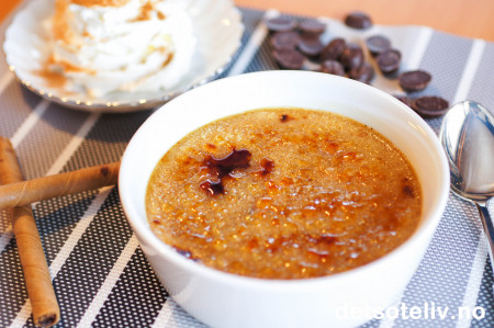 Espresso Crème brûlée er en klassisk Crème brûlée som jeg har smaksatt med espressopulver. Den kremete puddingen under det sprøe sukkerlokket er ikke en av verdens mest populære desserter uten grunn. Litt kaffesmak gjør desserten bittelitt annerledes, men ikke mer enn at den er veldig gjenkjennelig. Ved siden av serverte jeg pisket krem med kaneldryss, mokkasjokolade og sprø sjokoladekjeksruller. Oppskriften gir 6 porsjoner.