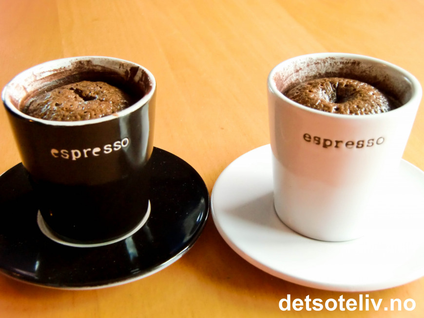 Smør 2 - 4 espressokopper med litt smør (antall avhenger av hvor små kopper du bruker). Ha en liten teskje kakao i hver kopp og beveg koppen slik at kakaoen fester seg langs kantene. Tøm ut kakaorestene og fordel deigen i koppene.