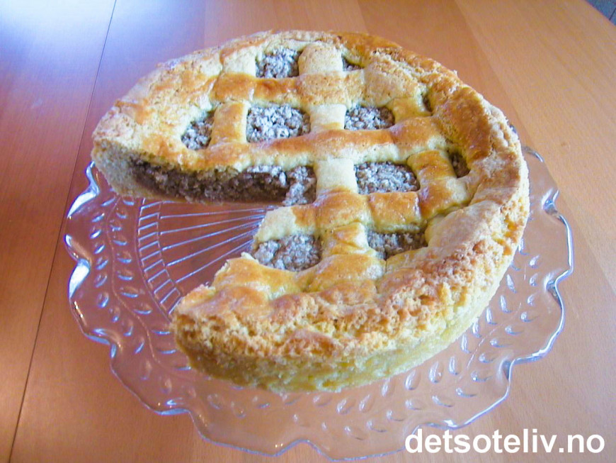 Bland ingrediensene til fyllet sammen og ha i formen. Bruk resten av deigen til å lage gittermønster oppå kaken.