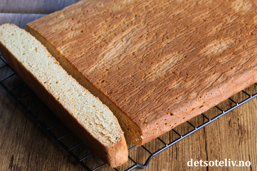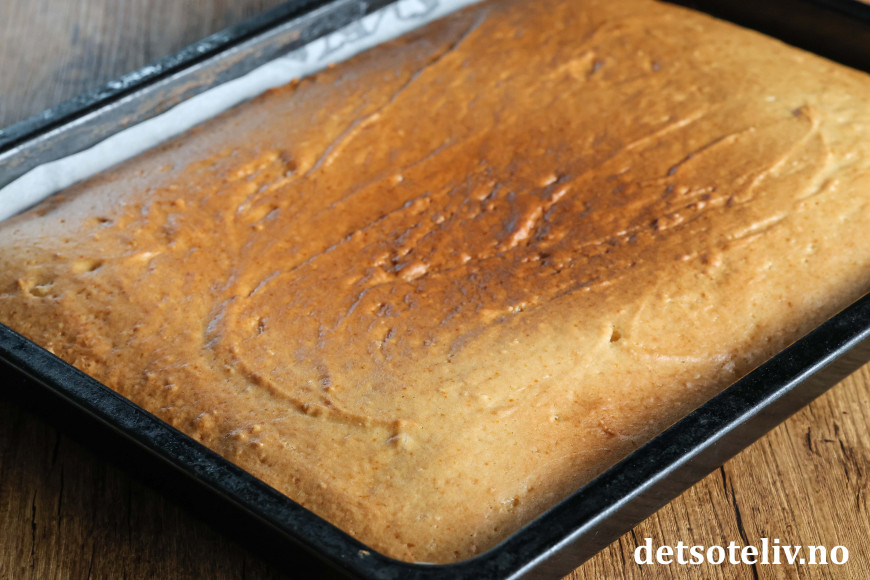 Stek kaken nederst i ovnen ved 180°C i ca. 30–40 minutter (sjekk med en kakenål at kaken er gjennomstekt før du tar den ut av ovnen).