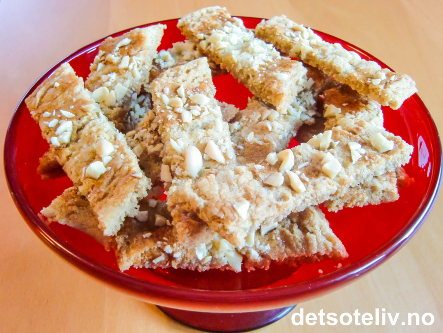 Stekes midt i ovnen ved 200°C i ca 10 minutter. Skjær opp lengdene på skrå med 2 cm bredde med en gang de tas ut av ovnen. Avkjøl kakene på rist.