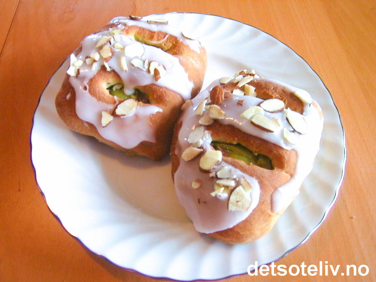 Stek bollene midt i ovnen ved 225°C i ca 10 min. Avkjøl bollene helt før du pynter dem med litt melisglasur og mandelflarn eller hakkede pistasjnøtter.