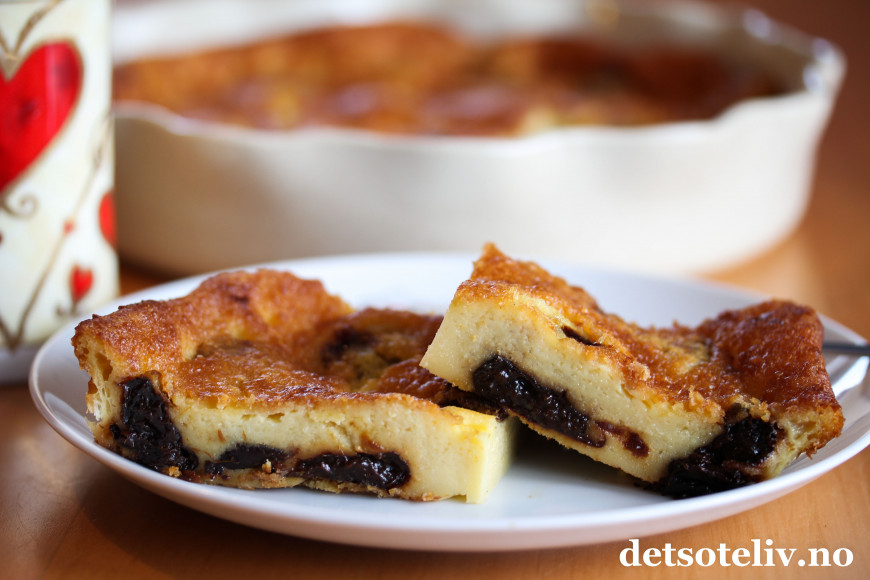 Finn frem en ildfast form. Den bør være ca. 24-26 cm i diameter og ha litt høye kanter (se tips). Smør den godt og legg de bløte sviskene i bunnen av formen. Hell over røren.
