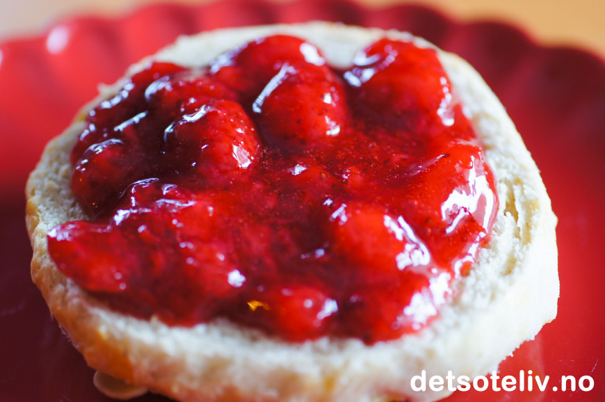 Dekk den nederste halvdelen av bollen med rørt jordbærsyltetøy (ja, bruk rikelige mengder selv om det blir litt sølete å spise bollene! )